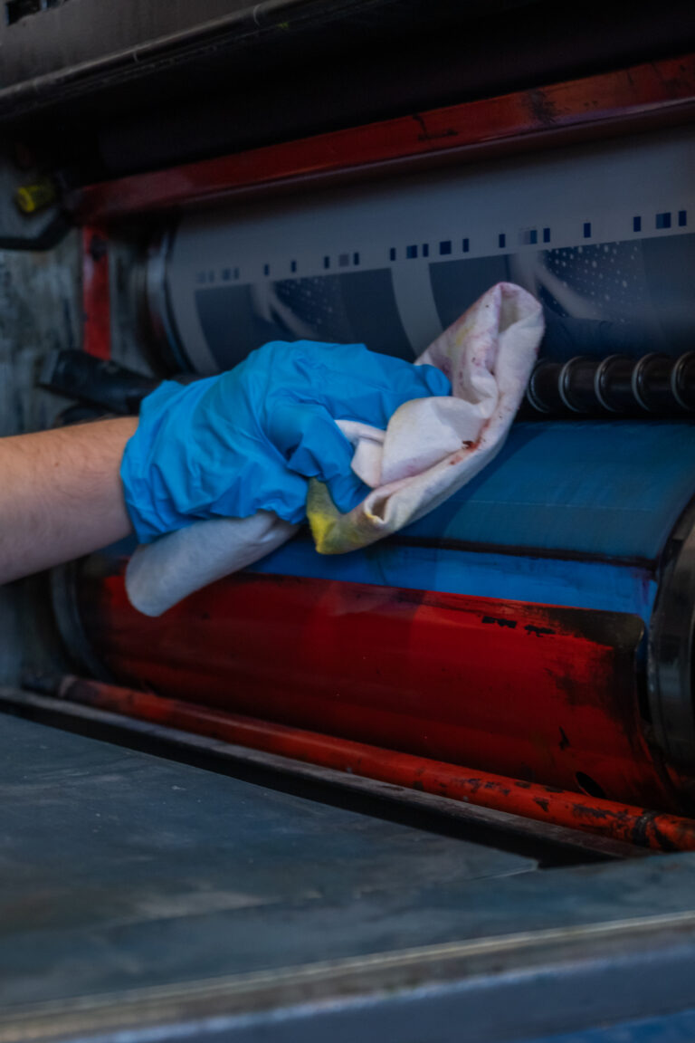 Damit die Maschine einwandfrei läuft, muss die Druckmaschine gepflegt und sauber gehalten werden. Dazu gehört: