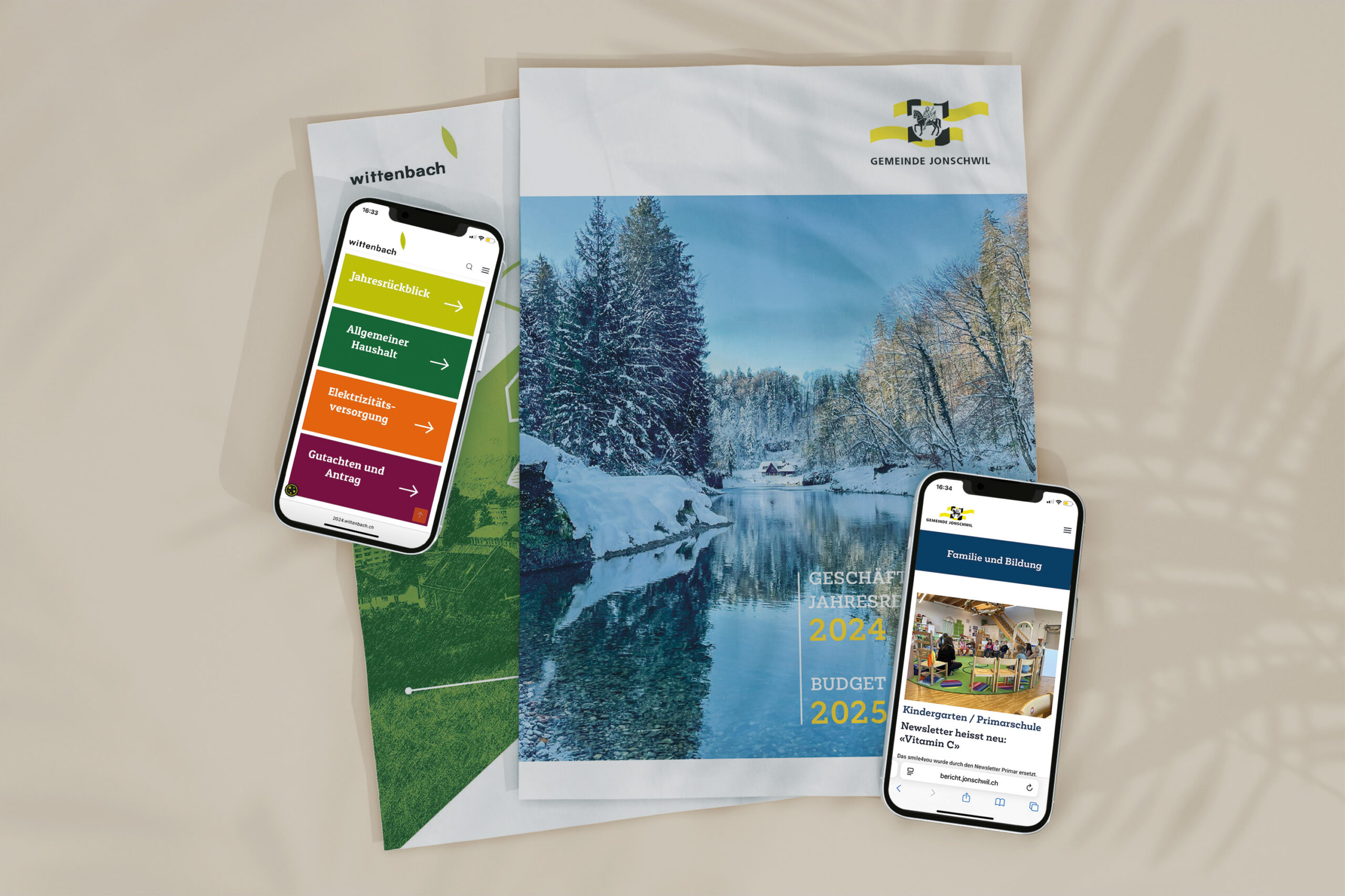 Für die Gemeinden Wittenbach und Jonschwil durften wir zwei Geschäftsberichte neu gestalten, die diesen Ansatz beispielhaft umsetzen. Der gedruckte Bericht konzentriert sich auf die wichtigsten Botschaften und erreicht durch die Streuung in die Haushalte die nötige Aufmerksamkeit. Die begleitende Landingpage dagegen schafft Raum für Vertiefung – etwa durch Videostatements oder den Zugang zu detaillierten Finanzzahlen im Download-Bereich. Die digitalen Berichte sind nicht nur optisch attraktiv, sondern bieten auch einen barrierefreien Zugang, sind suchmaschinenfreundlich und mobiloptimiert.
